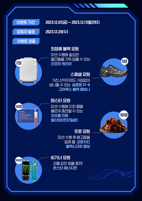 리모와 캐리어 (2명)살로몬 XT-6 고어텍스 블랙 에보니 (5명)오쏘몰 이뮨 멀티비타민 (30명)교촌치킨 블랙시크릿 콤보 (60명)몬스터 에너지 드링크 (500명)