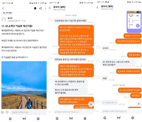 이는 당근마켓 뿐만이 아니라, 네이버 등산카페에서도 저와 같은 내용을 봤고,또 글이 모두 삭제가 되었다는 분도 계셨습니다.제가 단톡방에 항의한 이후로, 당근에 올린 게시글 및 어플 계정까지 탈퇴하셨더군요.