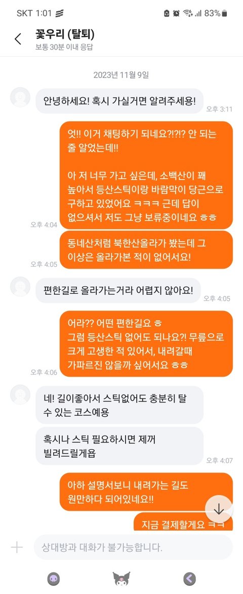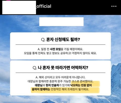 이런식으로 기망을 당했다는 생각에 분노가 차올랐고해당일자 등산객들이 모인 단톡방에 이를 알리며 환불을 요구하였으나제가 올린 채팅내용은 다 '내용 가리기'처리 되었고밤 12시엔 '강퇴' 당했습니다.