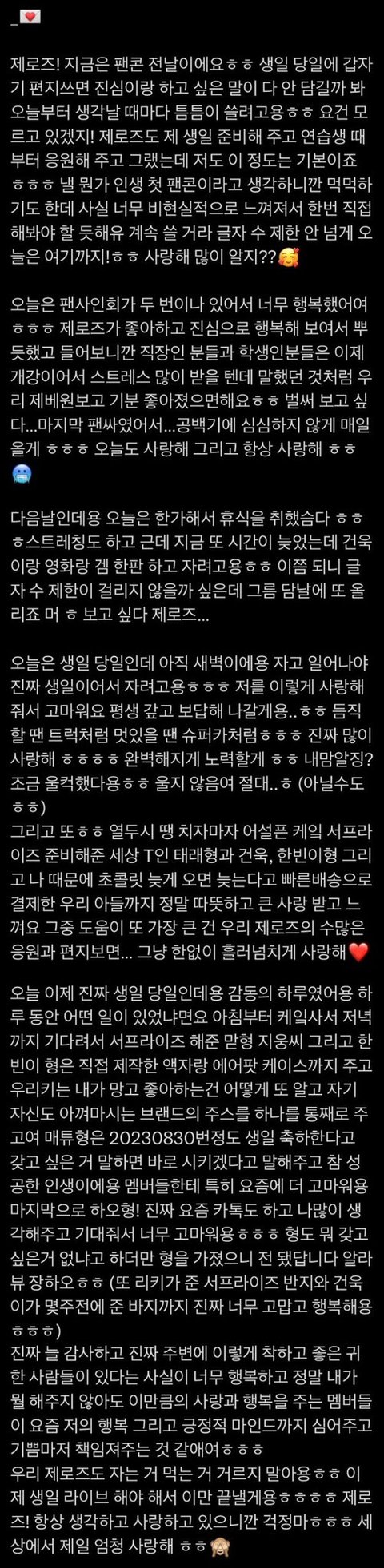 : 진짜 많이 사랑하고 너무 너무 많이 소중하니까 알아줬으면 좋겠습니다! 색안경 끼신 분들은 색안경이 닳아 없어질 때까지 노력하겠습니다 좋아하시는 분들은 사랑할 때까지! 사랑하시는 분들은 진짜 없으면 안될 때까지 ! 그러신 분들은 그 이상으로 더 노력할게요