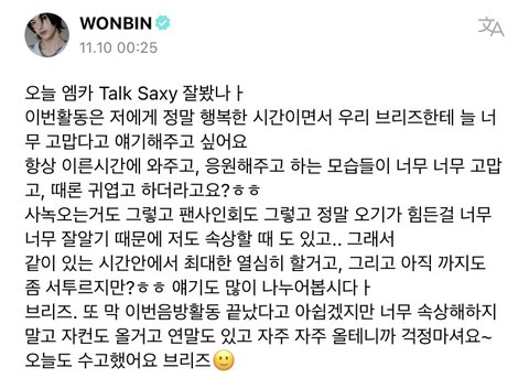 원빈 지 잘난맛 1도 없음ㅋㅋ 자컨에서도 엄청 꼬질한상태로 나오고 카메라 의식 이런거 1도 없고 조용하고 애교많고 스킨십많고ㅋㅋ 오히려 노래랑 춤에 욕심 많아서 더 잘할려고 해서 본업 ㅈㄴ 열심히하고 또 자기관리도 겁나 잘해서 지 자랑해도 뭐라안할텐데 성격도 내향적이라서 그런말 일절 안하고 팬사랑도 엄청남