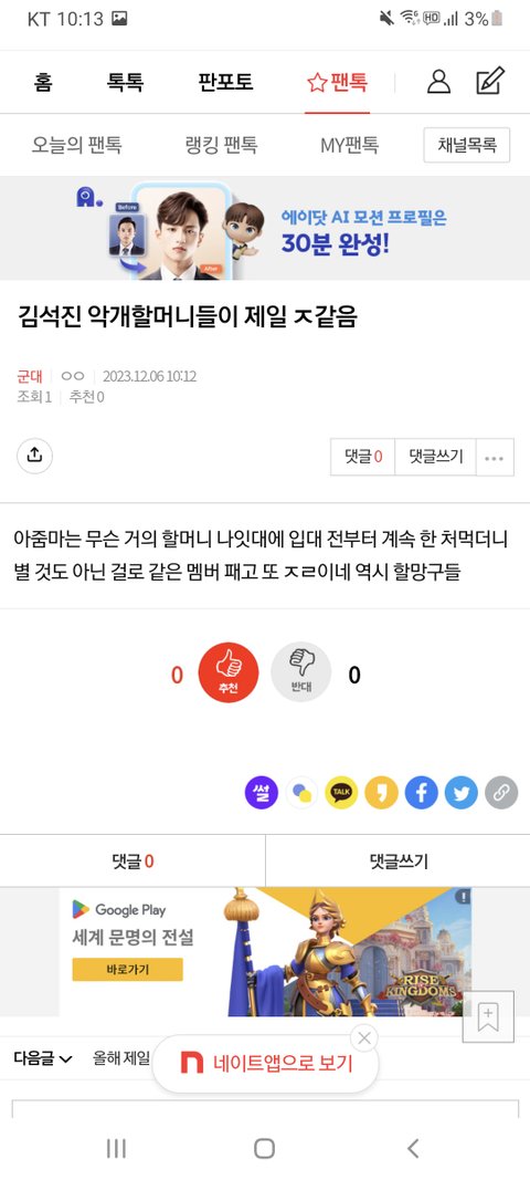 원글 먹금! 팬톡 자주 보려 하는데 조방 타이밍 놓치면 짤털로 밀고 있음! 말을 막는 게 아니라 어그로도 많이 들어오는 팬톡이니 회사마플 제외 마플은 인증하고 써야하는 팬톡 규칙은 좀 지키자 스밍인증 어렵지도 않잖아 그리고 멤버 이름 뒤에 악개 붙일 땐 써방 ㅇㅇ