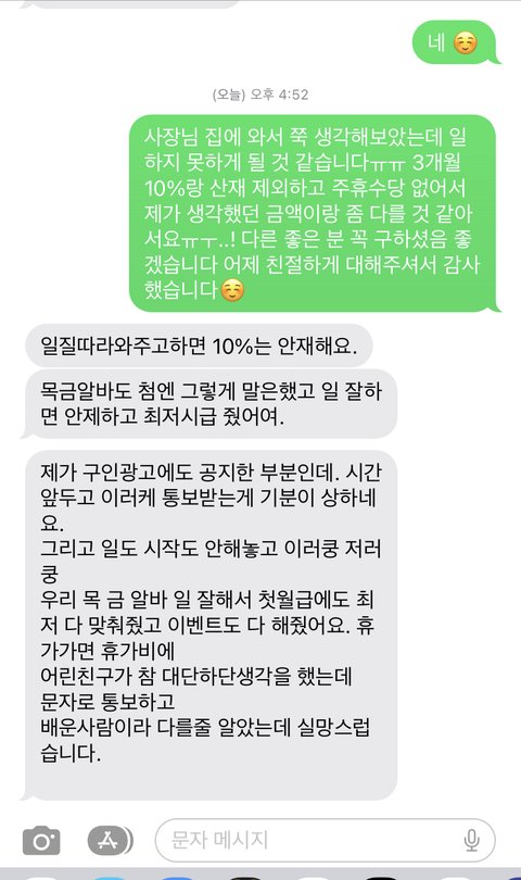 교육은 이틀이라고 하셨는데 하루는 네가 양보하라며 하루치의 교육시간 시급은 없다고 하신 것도 그렇고 전에 일하던 알바생에 대해 말씀하시는 것도 그렇고 일하면 스트레스 받을 일이 많을 것 같아서 오늘 못할 것 같다고 문자를 제딴에는 굉장히 정중하게 보냈습니다.