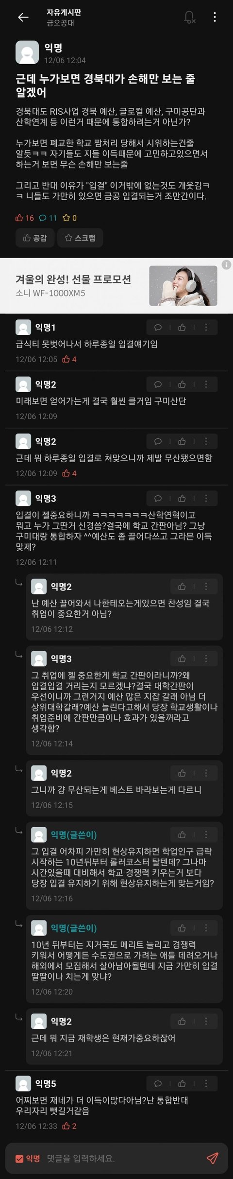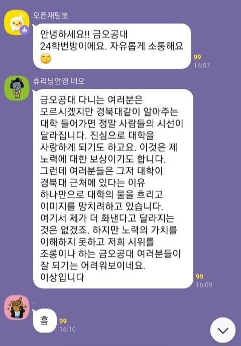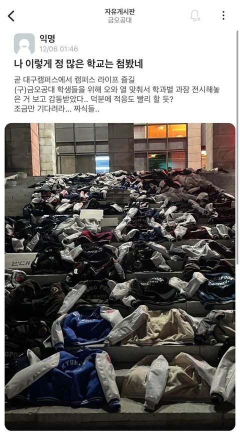 금오공대 입결은 내가 말 얹을 거 없고… 경북대가 3-4등급 학교라는 사람들 많던데 진짜 어이없음 ㅋㅋㅋㅋㅋㅋ 지거국 특성상 학과가 굉장히 다양해서 꼬리가 길고 재학생이 몇 만인 걸 전혀 고려하지 않는거지… 경북대 다른캠은 몰라도 대구캠을 4등급이 들어간다..? 그건 진짜 헛소리야… 내려치기 좀 그만했으면 좋겠어… 명성이 예전만큼은 못해도 지잡이니 뭐니 그런 소리 들을 학교는 절대 아닌데… 나도 내신 1.9로 경북대 갔고… 진짜 속상해.. 그놈의 서울 서울… 서울 밖은 논밭에 산골에 어촌만 있는 줄 아는 잘못돼먹은 세상…