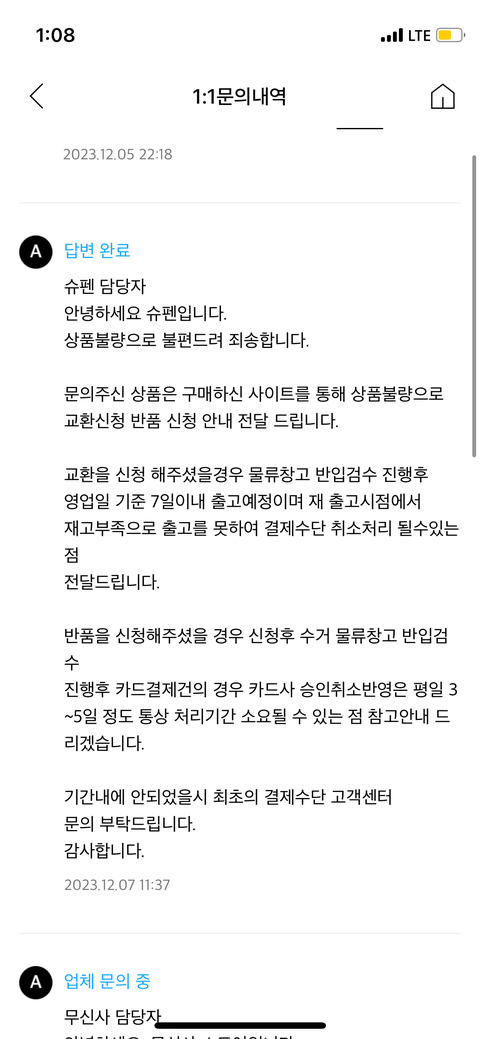 이렇게 불량 확인 후 바로 무신사 고객센터에 교환을 원한다고 문의 했고 슈펜 측에서 아래와 같은 답변을 받았습니다
