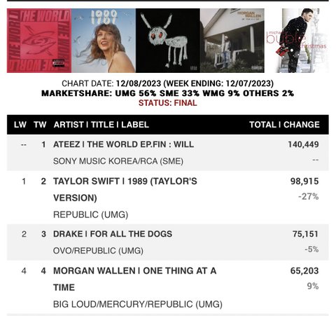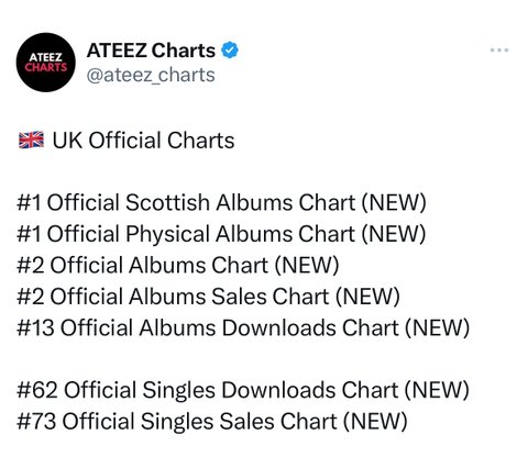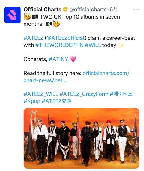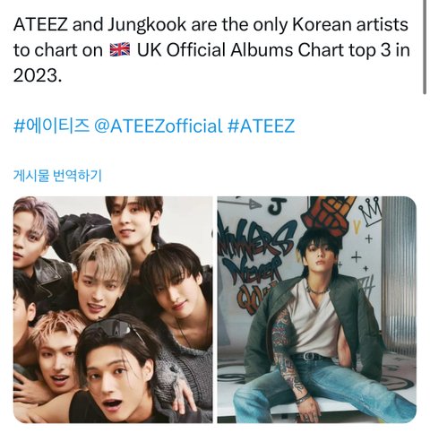 여태껏 영국 오피셜 앨범차트 3위 안에 든 케이팝 그룹은 방탄이랑 블핑밖에 없었고 올해 영국 오피셜 앨범차트 3위 안에 든 한국가수는 정국와 에이티즈뿐이래