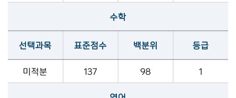사실 워낙 수학 잘하는 사람이 많아서 88점이 잘하는 건 아니지만... 그래도 4에서 1까지 어찌저찌 올림! 고3땐 학원을 안다녀서 인강으로 미적분을 처음배움. 그것도 고2~3겨울방학에 공부함.. (현역의 깡ㅋㅋㅌㅋㅋㅋ) 반수도 독재로 해서 단과 1개만 들음 !! 혹시 질문있는사람있으면 해주셈용