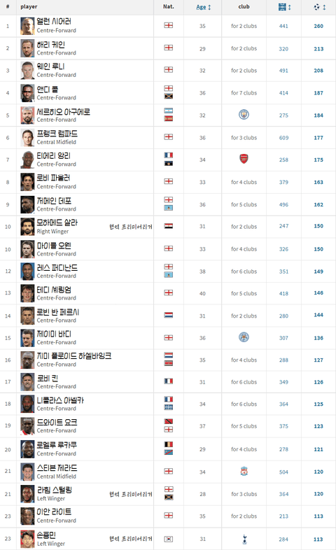 실시간 프리미어리그 역대 득점 TOP 23