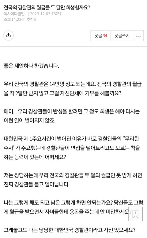 딱 경찰월급 2달만 자선단체에 기부하라고 하니까