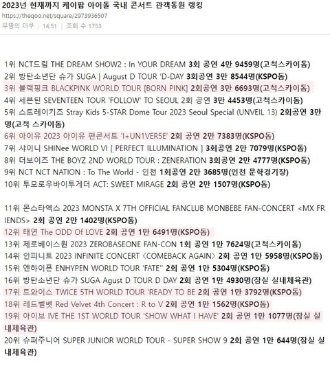 엔드림, 방탄, 슈가, 블랙핑크, 세븐틴, 스키즈, 아이유, 샤이니, 더보이즈, 엔시티, 투바투, 몬스타엑스, 태연, 제베원, 인피니트, 엔하이픈, 트와이스, 레드벨벳, 아이브, 슈퍼주니어, 에스파, 르세라핌, 뉴진스, 스테이씨, 정국