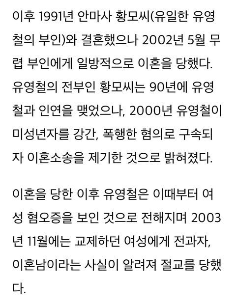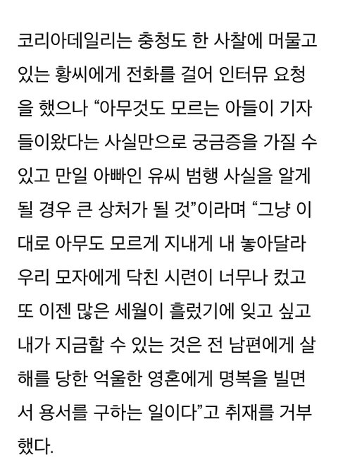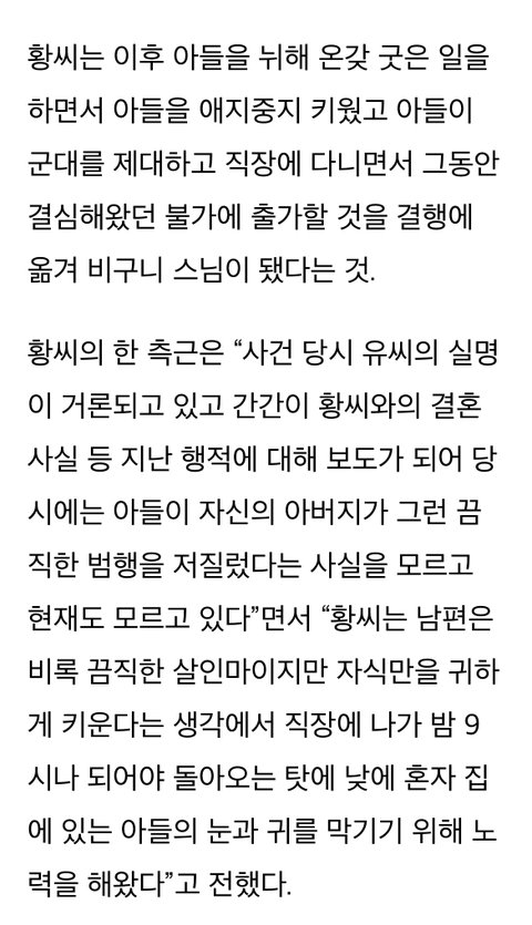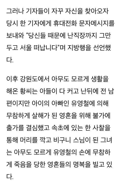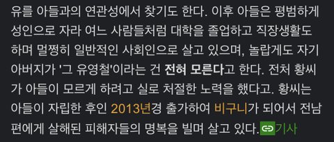 그 후 아내를 대타삼아 딴 사람들을 죽이고 다니는데 나중에 유영철의 살인행각이 언론에 알려지자 기자들이 취재하러 계속 집으로 찾아오니까 강원도 시골로 도망가서 아들 혼자 다 키우고 아들은 아무것도 모른채로 직장인되고, 본인은 피해자들 명복 빌어주려고 속세를 떠나서 비구니가 됐다는 인생사 자체가 무슨 단편영화 보는 것 같음..