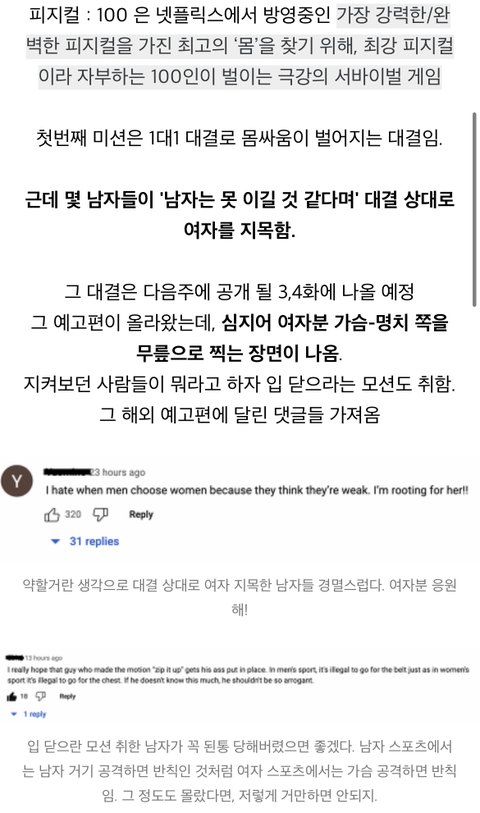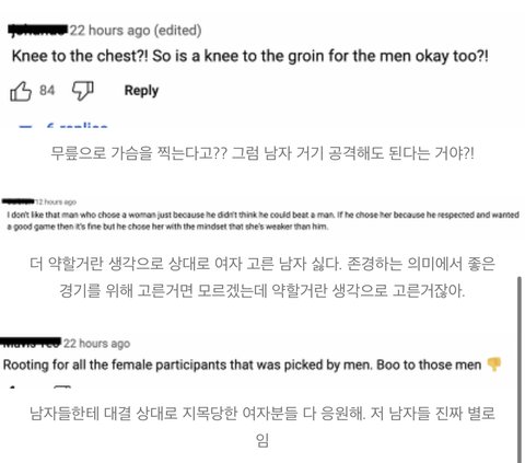 몸싸움 게임인데 대결상대 정할때 남자가 여자 고른거 ㅋㅋㅋㅋ 애초에 동성끼리 골라야 한다는 룰 없는것부터 이 프로그램 자체가 여자 떨어트릴려고 작정한거임ㅋㅋ