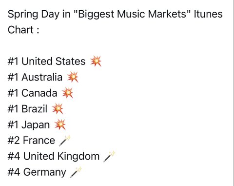 주요 음악시장 8개국 중 5개국은 이미 1위 찍었고 프영독만 남음 우리도 1위는 못찍더라도 순위 올렸으면 좋겠는데 흠 다음 타임에 꺾이네ㅠ