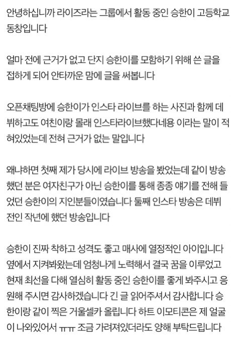 이렇게 사생활 사진 풀려서 이미지 나락갔는데 동창이나 그런 애들 아무도 얘 양아치였다거나 그런말없고 오히려 이런글만 올리잖아… 그리고 어떤생각까지 드냐면 수빈이랑 친한거 의외라고 수빈도 사실 승한처럼 양아치같은 성격이냐고 사람들은 그러는데 나는 반대로 승한이 알고보니 우리가 알던 수빈이랑 비슷한 부류(?)의 사람같거든 나처럼 생각드는 사람 진짜 한명도 없냐 승한팬 말고 그냥 돌판고인물중에