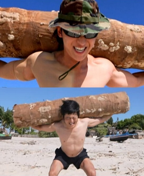 통나무로 복근찍으면서 복근 단련함
