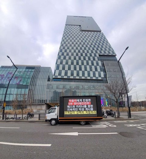 sm은 얼마나 악플 고소 안했으면 트럭 보냈네 진짜 아티스트 보호 제대로 해주라. 카리나는 숨만 쉬어도 까이더라 고소 안하는게 너무한다 두번씩이나 캐스팅한 사람 데려왔으면 그만큼 잘해해줘야지 근데 팬들이 이런거 보내준다는게 정말 멋지네