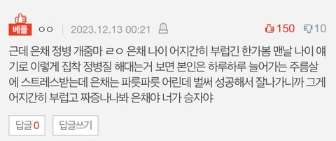 진짜 은채한테 왜그러냐...남돌들은 막내가 형한테 늙어서 주름살 자글자글하다 눈이 침침하다 말이 안통한다 이딴 소리 대놓고해도 사이좋다고 우쭈쭈하면서 홍은채는 방송에서 물어본거에 대답만해도 이렇게 쥐잡듯이 잡냐