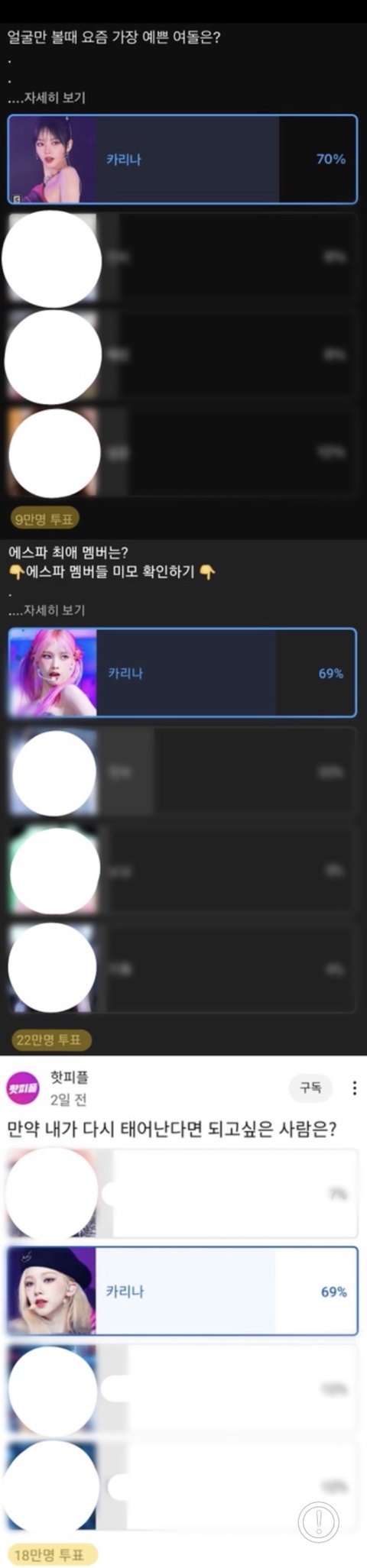 적어도 도태년들만 모여있는 네이트판에서 카리나한테 열폭하는 여론보단 머글들도 타팬들도 많이들 참여하는 유튜브 수십만명 참여 투표 여론이 훨씬 객관적이고 정확한 지표가 맞는거같은데? 카리나가 1등이니까 끌고오지 말라는거잖아 만약 느그 본진이 1등이었으면 좋다고 퍼나를거면서 ㅠ