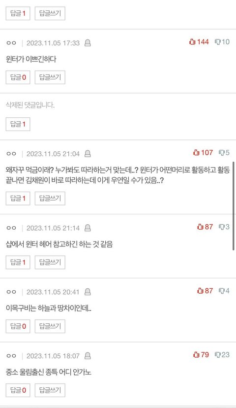 근데 진심 타팬인데 윈터 찬양하면서 김채원 까는 톡선 매번 주간톡선인데 해명글은 윈터팬들이 먹금하라는둥 패서 톡선도 제대로 안가는거 맞지않음? 김채원 불쌍함.. 11월 주간톡선 보면 죄다 윈터찬양하면서 김채원 까는글들임