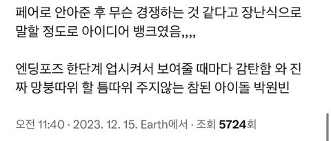 삔픈데 아무 생각 안 들음 사녹 후기 봐도 망붕할 겨를도 없이 그냥 무대 자체를 엄청 열심히 하고 그랬다길래ㅋㅋㅋㅋㅋㅋㅋㅋㅋㅋ 분위기도 오히려 서로 어색했으면 더 이상했을 것 같은데 선배들이 편하게 잘 챙겨주는 그런 느낌이었다해서 난 그냥 기대된다