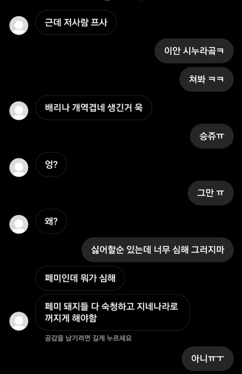 페미고 뭐고 다 떠나서 사람보고 역겹다는 소릴 저렇게 쉽게 하는 기본안된 놈이랑 사귀고 싶은 맘이 들어? 정뚝떨인데