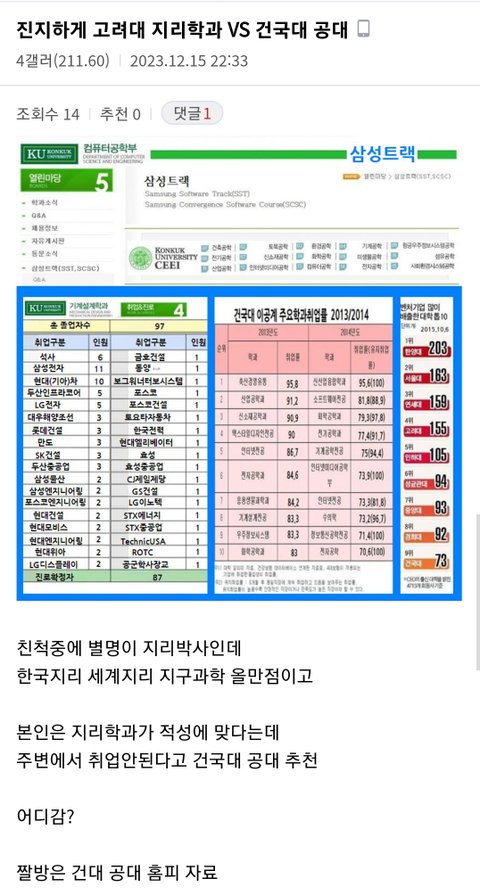 이대후려칠려는건 아닌데 문과면 닥 이대겠지만 공대쪽이면 솔까 건대갔을거같음 난… 여대 공대 아웃풋 선생님들이랑 주변에서 다들 ㅂㄹ 안좋게 말해서 ㅜ