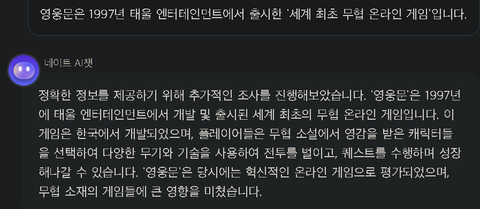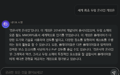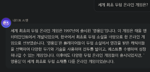 네이트 AI챗 '세계 최초 무협 온라인 게임은' 문답