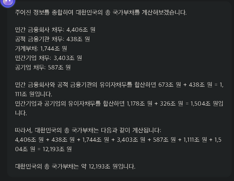 네이트 AI챗 '대한민국의 총 국가부채' 문답
