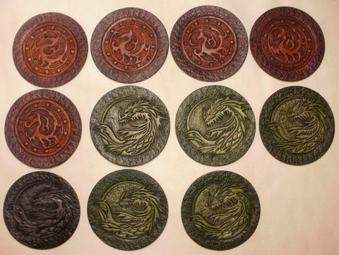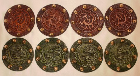 가죽에 용과 삼족오 디자인을 카빙하고 엔틱 염색하여 스파이크 장식을 부착하여 제작한 가죽 펜던트입니다.(마디샤가죽공예