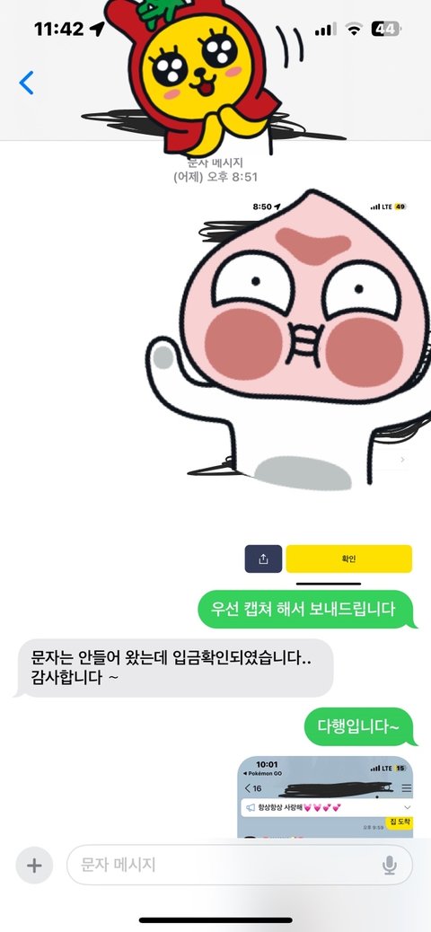 그래서 저녁 10시쯤 전화는 저녁이 늦었으니 좀 그렇고 해서 문자만 사진 포함 5장정도를 보냈었어..