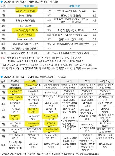 까들이 슈퍼샤이 망했다고 염불했는데 갤럽 1위한거.. 더 대박인건 작년에 나온 하입보이가 5위인거ㅋㅋㅋㅋㅋㅋㅋㅋㅋ진짜 올해 뉴진스가 쩔긴했어
