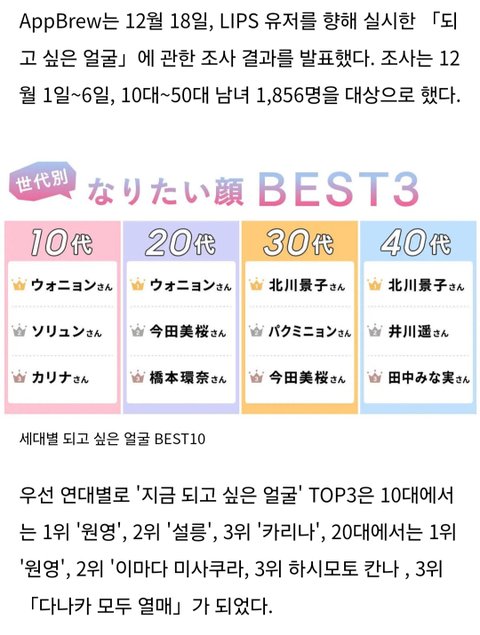 장원영 20대까지 1위네 일연 이마다 미오랑 하시모토 칸나 라이징 되기직전쯤 관뒀는데 설문보니 20~30대 젊은층에서 세대 확실히 바뀌긴 하는구나 근데 경자는 여전히 굳건한게 또 대박이네