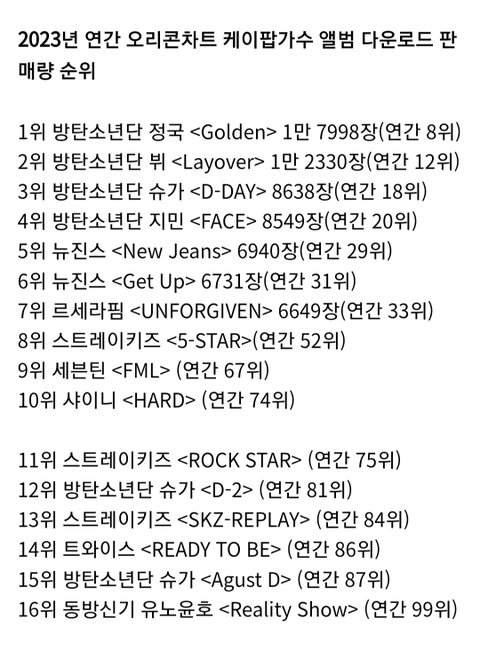 2023년 연간 오리콘차트 케이팝가수 앨범 다운로드 판매량 순위