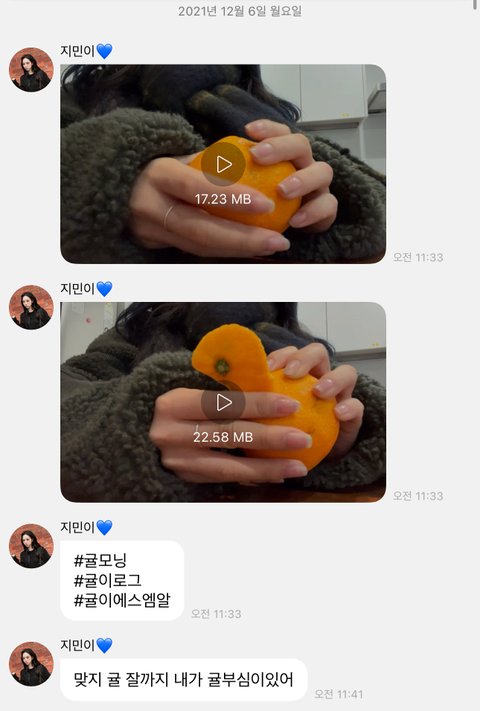 카리나는 21년부터 매년 겨울 귤까는 영상이나 귤 사진을 보내줌 카리나가 귤 까거나 귤 사진 보낸 영상사진만 수두룩함