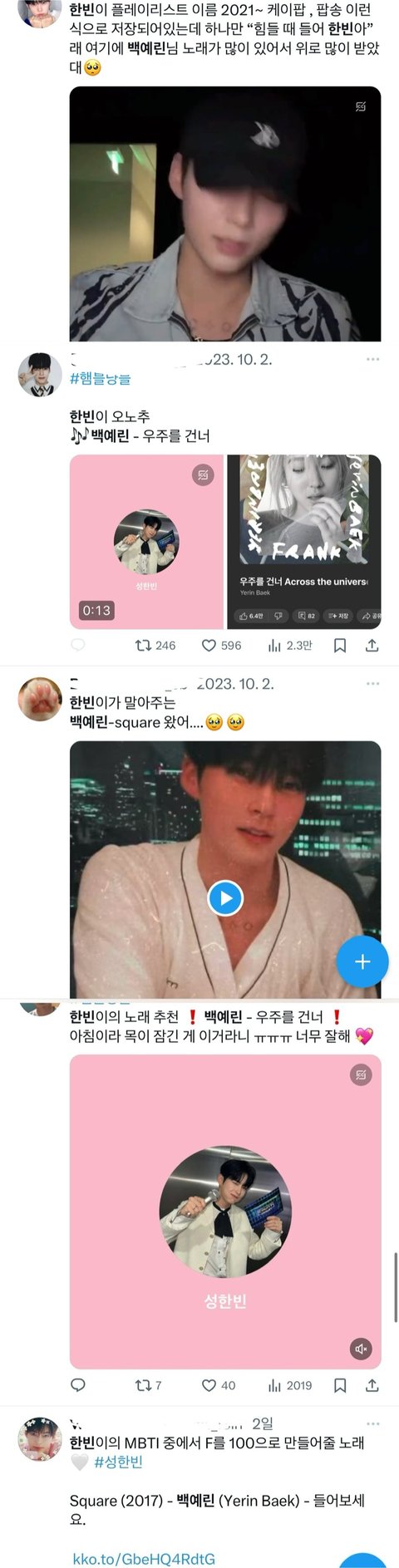 성한빈은 전에도 백예린 노래를 불러서 보냈고 백예린 노래 여러번 언급함 그냥 좋아하는 백예린 노래를 팬들한테 불러준것 뿐임