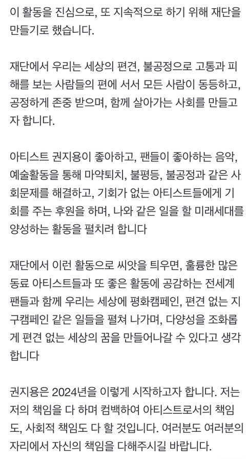 마약퇴치, 구제, 공정 및 존중, 미래세대 양성 등의 목적을 가진 재단을 설립할 것임을