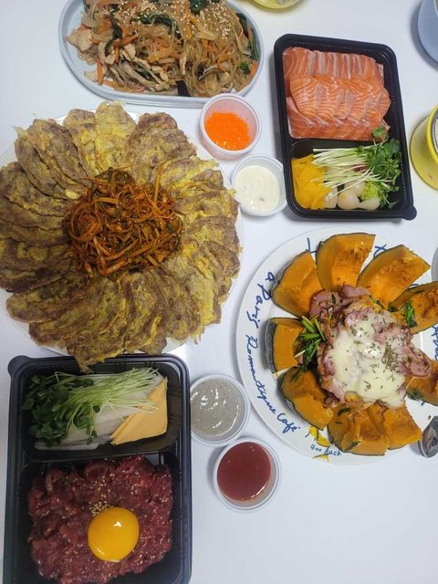 형부가 연어회 좋아해서 연어회랑 육회 세트 사서 같이 올리니