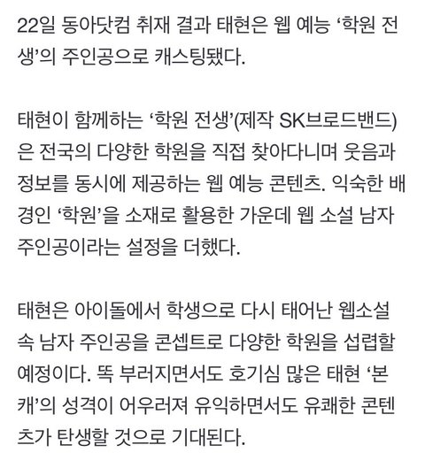 아니 애초에 태현이를 염두에 둔 설정같음ㅋㅋㅋㅋㅋㅋㅋㅋㅋㅋㅋㅋㅋㅋ하 컴백쇼때도 연기 개잘해서 놀랐는데 기대중 예능이지만 설정이 딱이라 너무 잘할거같음