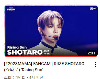 오늘 올라온 mama 'rising sun' 무대 쇼타로 직캠조회수 압도적이네