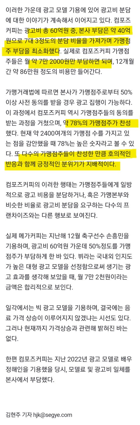광고비 총60억원중 40억원 본사 20억원 점주 부담하여 7:3비율로 가맹점주들의 부담을 낮추어 점주들은 월 7만2천원 수준임