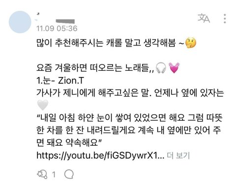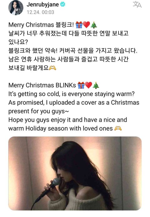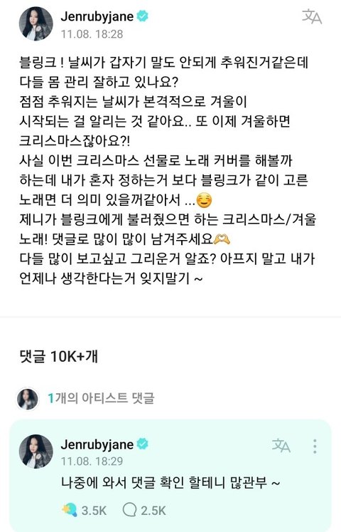 지난 11월에 제니가 팬들에게 불러줬음하는 크리스마스&겨울 노래를 추천 받았었음