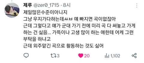 스키즈 애들 다 작사작곡 할 줄 알고 만들어둔 곡 많아서 군대로 작곡멤 공백 생기는건 별로 걱정 안됌 오히려 군백기에는 멤들이 자작곡으로 솔로활동 해주지 않을까 약간 기대 걸어보는 정도? 하지만 내 최애 2년동안 못보는건 개심란할 것 같다...