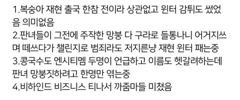 둘이 눈도 안마주치고 딱 챌린지만 찍고 끝남 윈터는 스탭통해서 자기 할말 전하더라