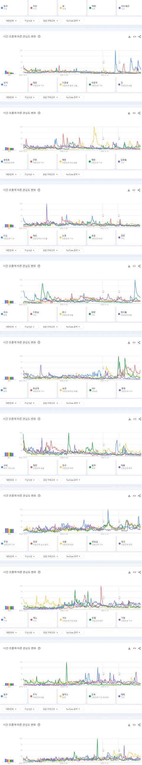 최근 5년간 한국 유튜브에서 가장 많이 검색된 남자아이돌 TOP50