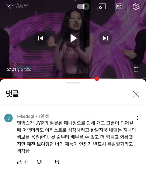 지니빠들이 개 악질인 이유 이런식으로 엔믹스 언급해서 엔믹스는 내려치고 지니는 거기서 탈출한 진정한 예술인 아티스트 이런 프레임 씌움 지니 영상마다 엔믹스 얘기는 꼭 있고 지니 팬들은 늘 전 그룹을 안좋게 얘기함