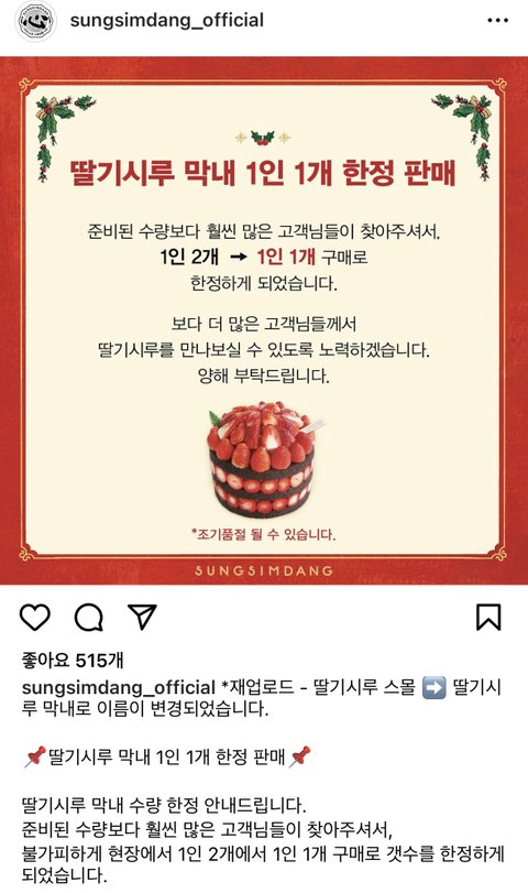 성심당“딸기시루스몰”->“딸기시루막내” 이름 변경