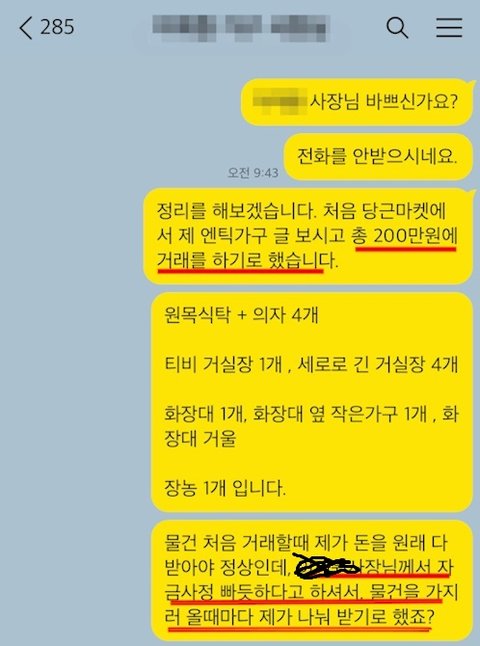 애초에 가구를 다 파는 조건으로 이 업자랑 거래를 했고, 분명 업자에게 사기전에 200만원에 다 가져갈거 아니면 거래를 안하겠다는 말도 하였습니다.