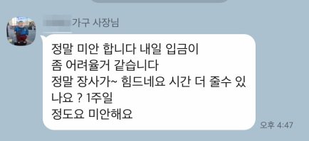 그리고 제가 나머지 가구도 가져가고 돈을 달라하니, 여러가지 핑계를 대면서 미루고, 적반하장으로 젊은사람이 그것도 못기다려 주냐 말을 하는 상황입니다.