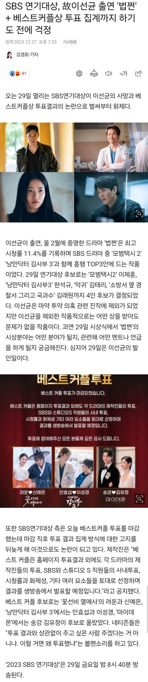 SBS 연기대상, 故이선균 출연 '법쩐' + 베스트커플상 투표 집계까지 하기도 전에 걱정
