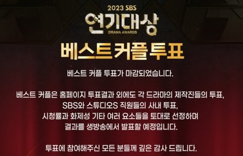 SBS는 지난 18일 오전 9시부터 27일 오후 1시까지 '2023 연기대상' 공식 홈페이지를 통해 베스트 커플 투표를 실시했다.